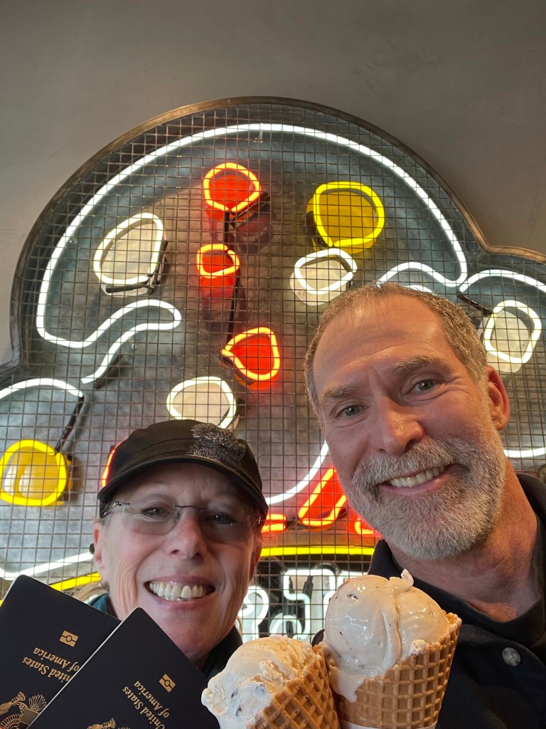 On Sunday (after another swim) we were treated to a free scoop of Ben and Jerry’s by the (American) owner of one of their stores here, just for showing an American passport. We’re all in a Facebook group for expats together, and it was really nice to go get some of the very best: Cherry Garcia (me) and Chunky Monkey (Lee). Both those flavors are not sold outside the retail shops, so it’s a fairly rare treat for us. We do miss sitting in Brattleboro with our neighbor Chuck and killing off a whole pint before breaking out the cards.