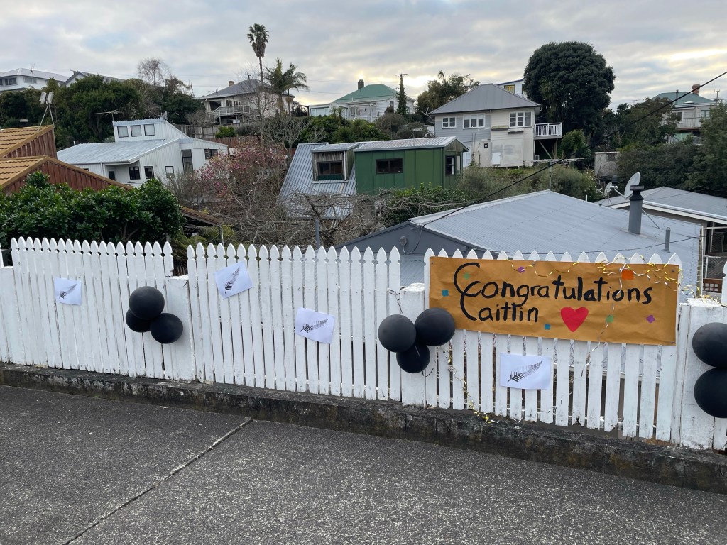 After weeks of training camp in Australia, more weeks of acclimation in Japan, the actual Olympics, and two weeks of quarantine on the South Island, our neighbor Caitlin is finally home, weighted down with her gold medal.