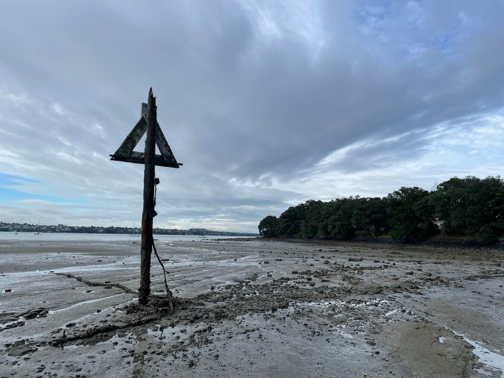 On yesterday morning’s walk, I took advantage of low tide and a dry week to clamber down off the perfectly good footpath and cross on the silty foreshore. I got this nice shot of the old navigation marker or whatever that thing is from a new vantage point, yay!