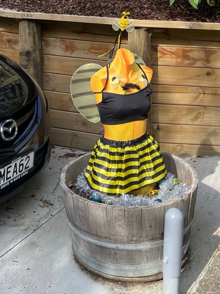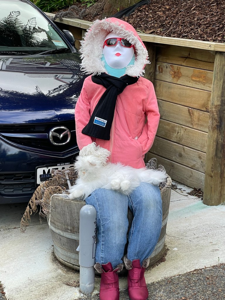 And while good intentions abounded, the planter never really got planted. So yet another neighbor reached deep into her storage area and produced a mannequin. An orange and yellow mannequin. With a fine perky figure.