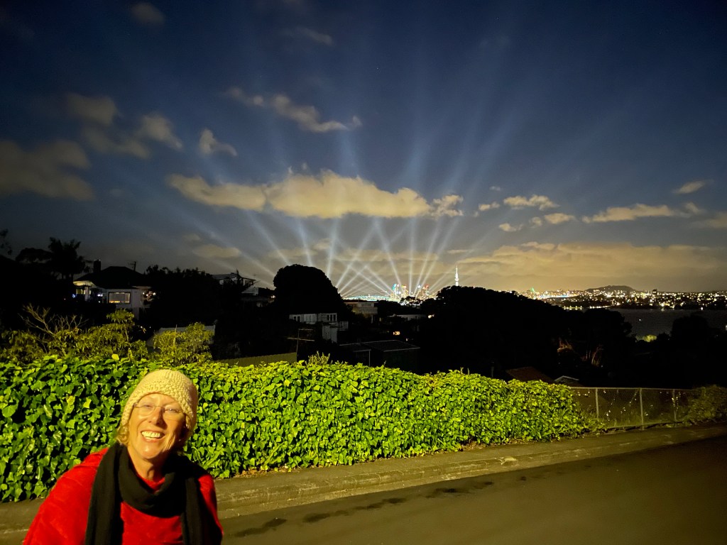 For whatever set of COVID-related reasons, Auckland canceled its fireworks display this year. But the Harbour Bridge was all lit up with laser lights, which was pretty cool. We had to go a tithe street to get this view, but still pretty cool!