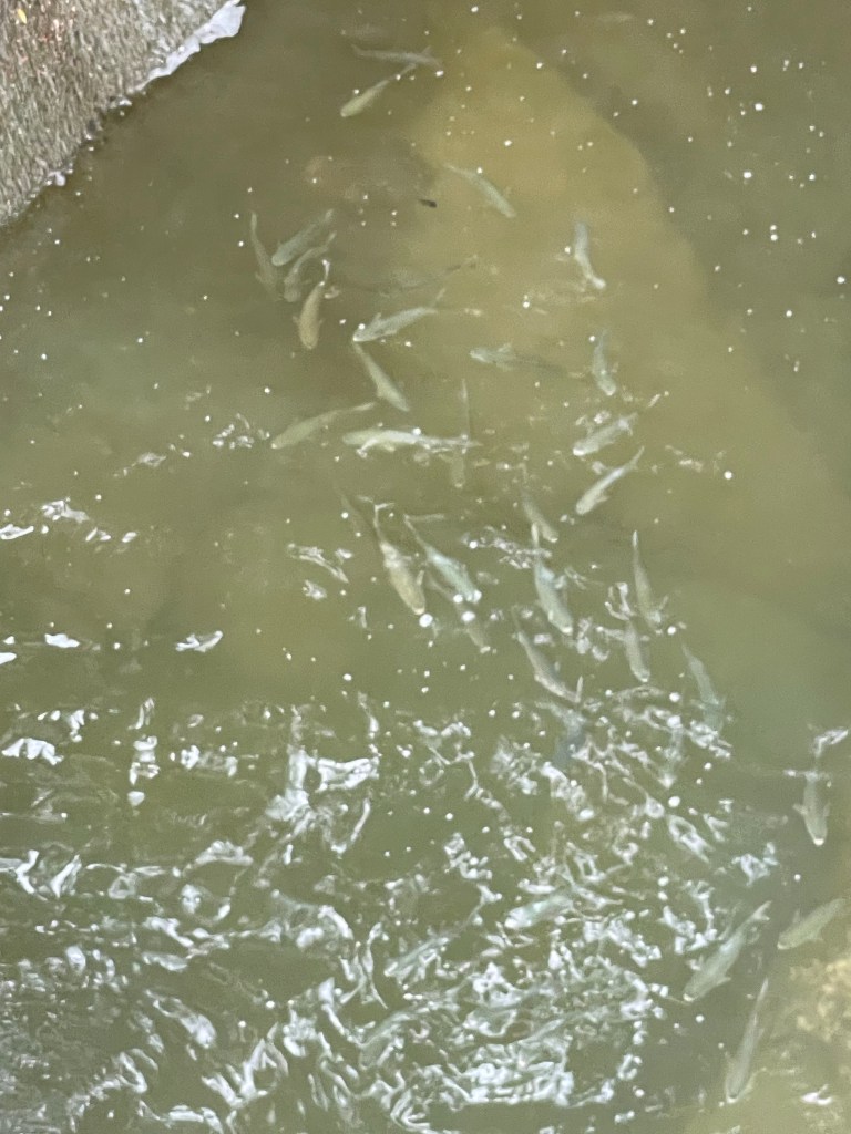 Then, just below the little dam separating the heron’s pond from the bay, there was a whole school of fish, something we’ve never seen there before. Not sure what kind they were, but big enough to eat…