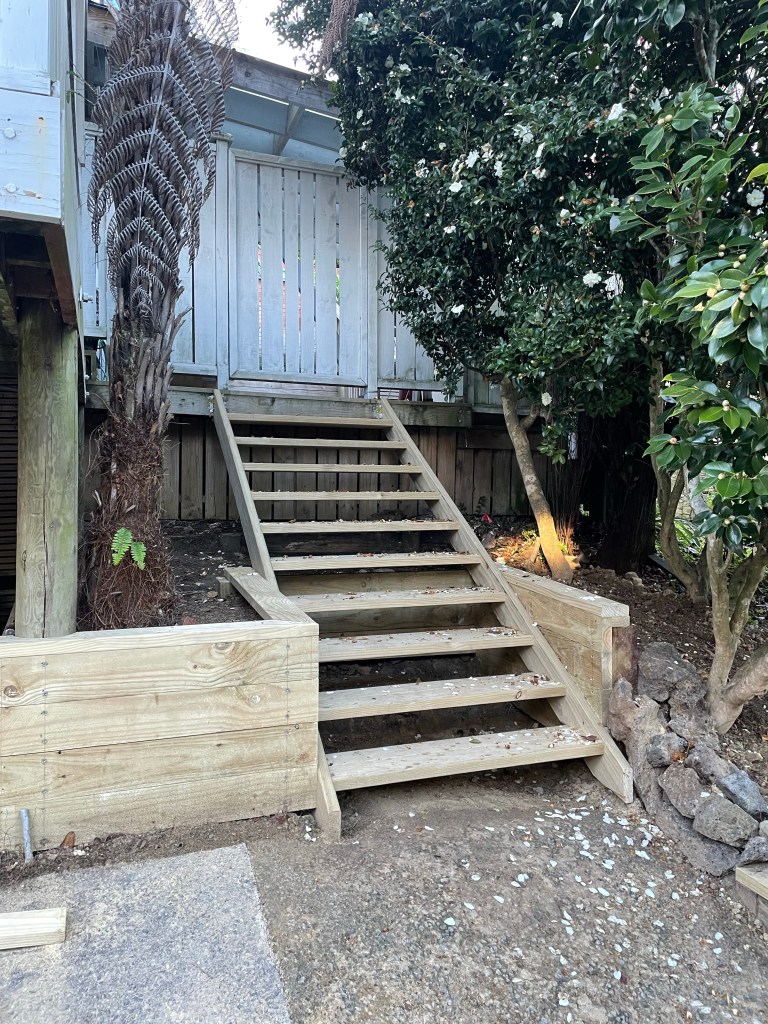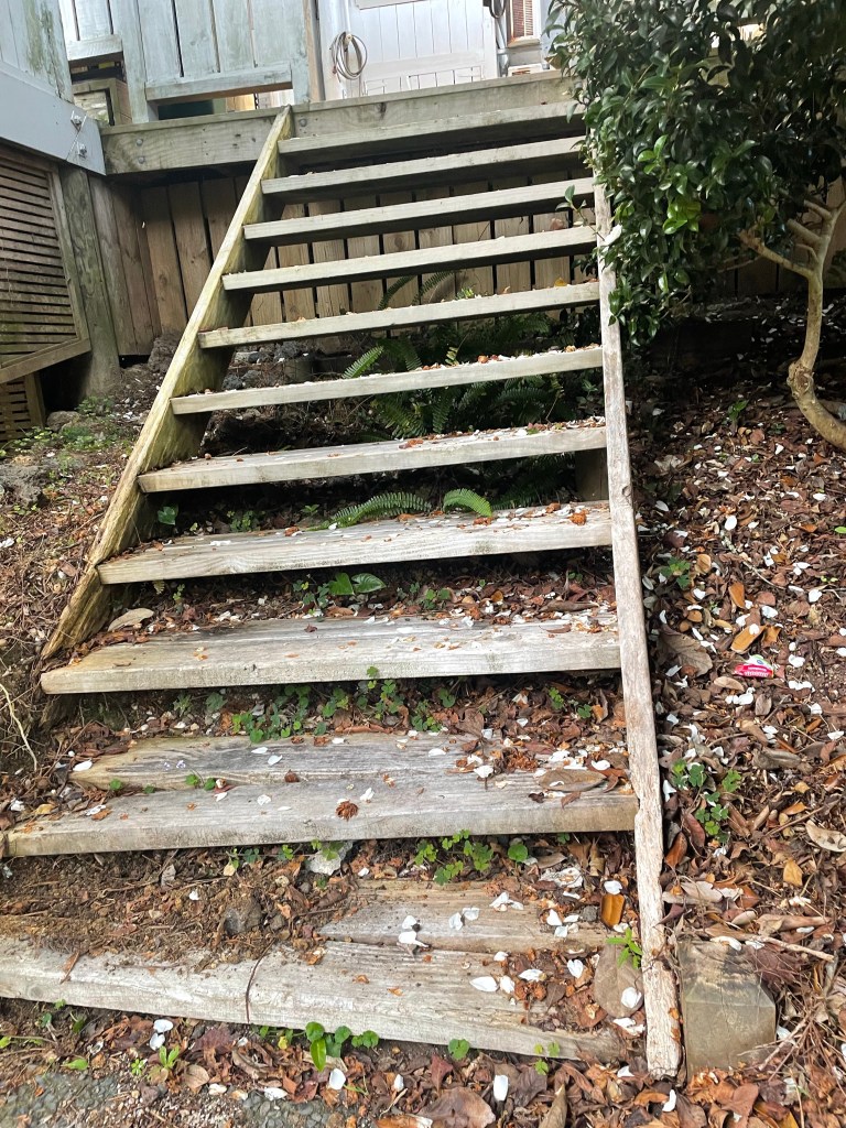 Before and after photos of our new back steps, part of the work we’re having done around the place.