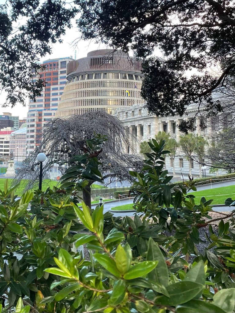 Here’s a less common view of New Zealand’s famous beehive Parliament building, taken from around the corner as I walked up to the Ministry of Health building to try and get some IT issues sorted out. It’s dramatic, the Beehive, but unlovely in my view.