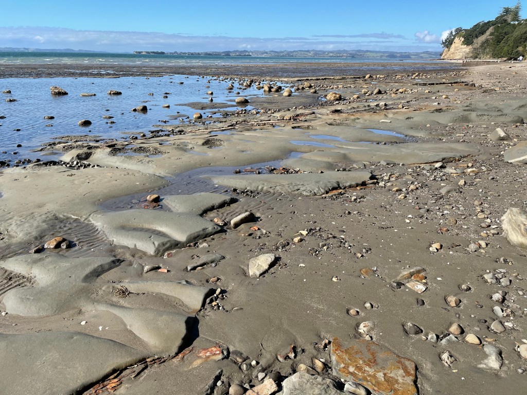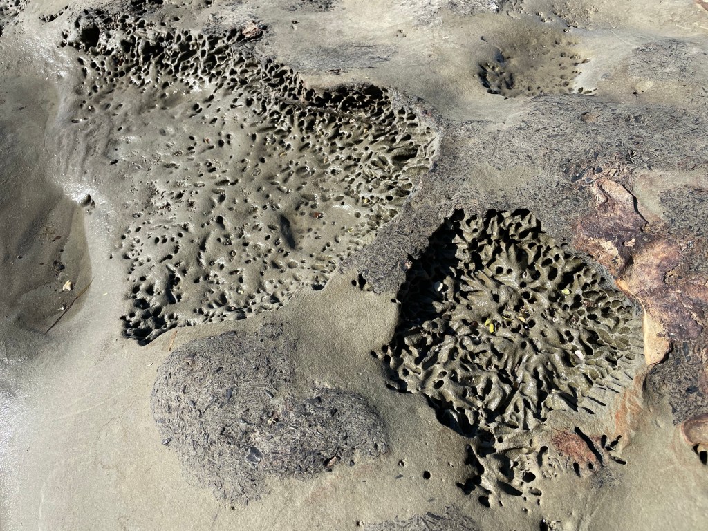 Which put us near Mellons Bay beach , a place we’d never seen before. It was low tide, and the narrow sandy beach gave way to a giant expanse of soft rock with all sorts of interesting formations. In the photo above it’s like the rock had been tunneled by worms or roots… no idea what the real story is.