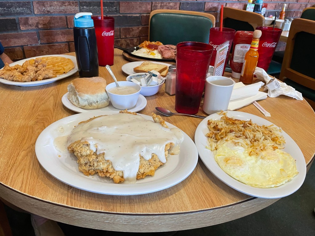 But this was the (quantity) highlight, breakfast the next day. A chicken-fried steak the size of a dinner plate, 3 eggs, a pile of hash browns and a biscuit as big as 4 biscuits. Gravy. More gravy. And all for less $$ than a small Auckland breakfast.