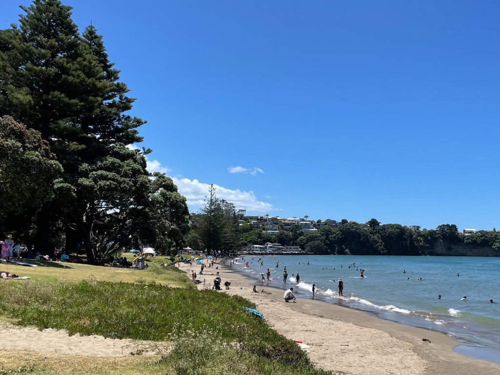 I’m normally at this beach in the very early hours for swimming. But I had lunch nearby yesterday and so walked over to check it out. It’s been pretty hot (at least by Auckland standards) and humid (by any standards) so a perfect time to go to the beach and enjoy the breeze off the water.
