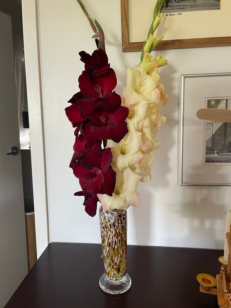 Gladioluses from our garden, in a vase I made a long time ago in a land far far away…
