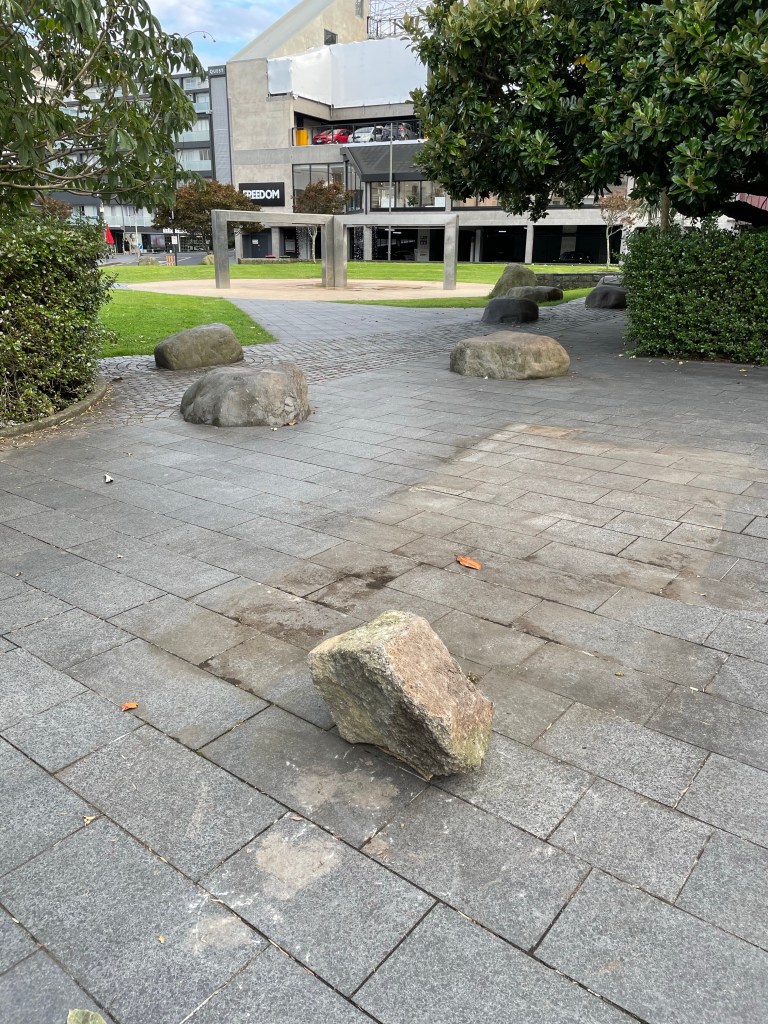 About where that rock in the foreground sits, there used to be a sculpture. I know because I walked by it every day to and from work for the first three years we lived here, and still do a couple of times a week on the way to the pool.