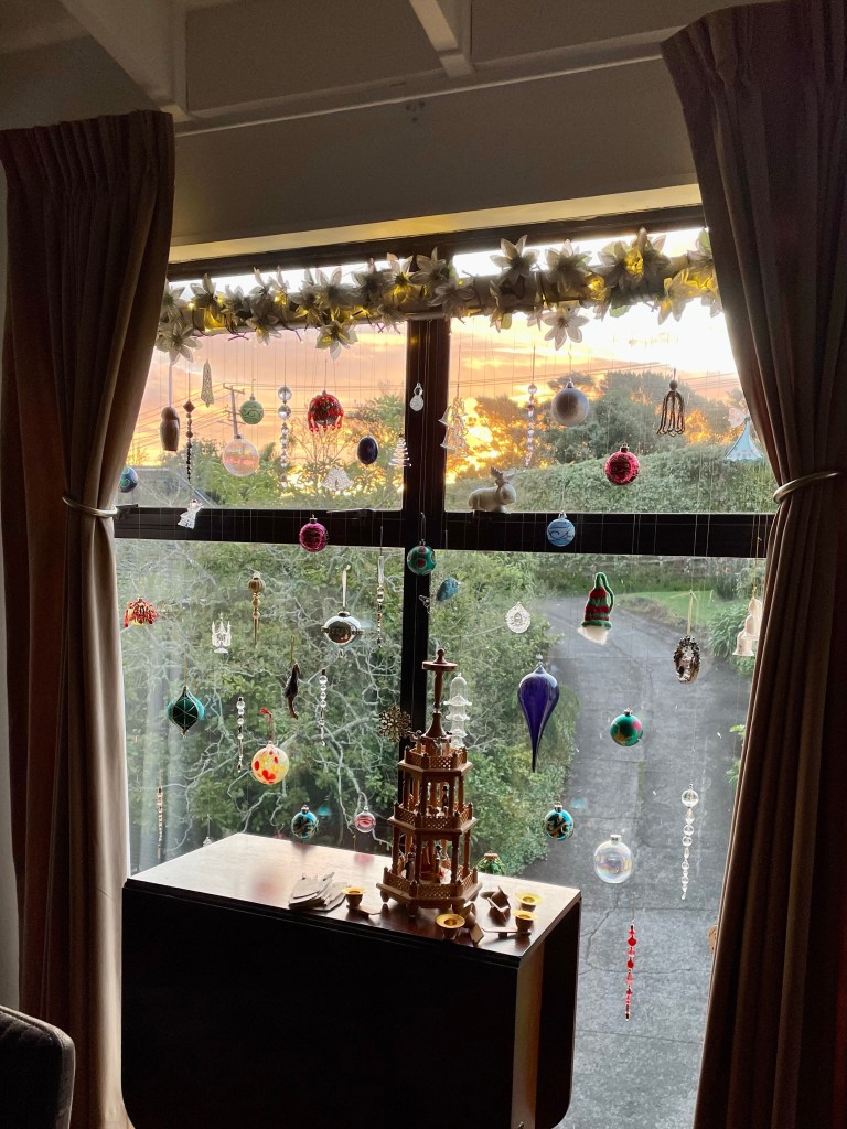 Instead of doing a tree which takes up much of the room, this year Lee hung a bunch of the nicest ornaments in the front window.
