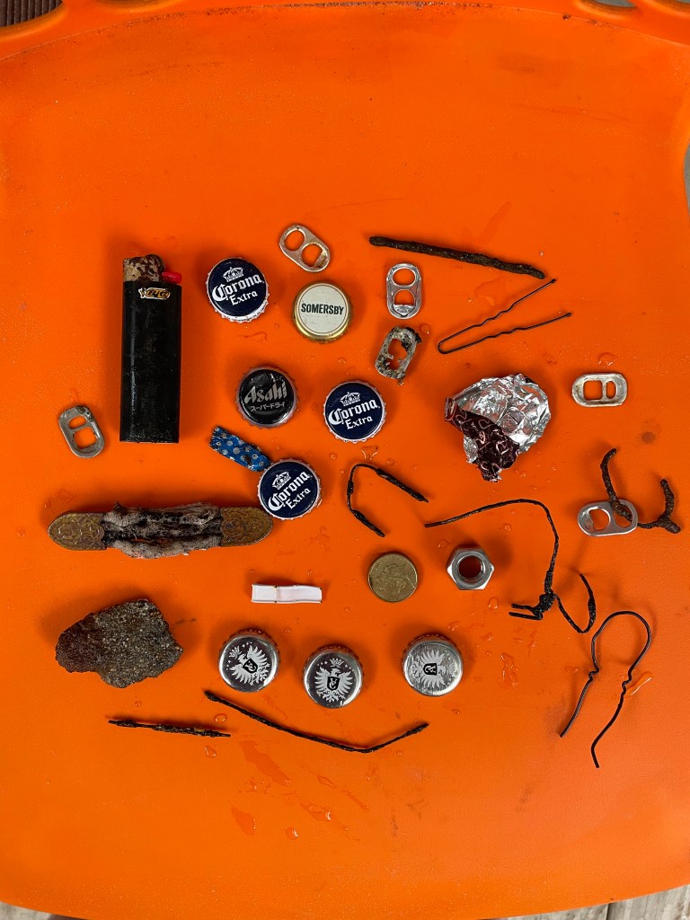 I’ve found a few “spendies”, coins that are just current spendable money, and even a couple of slightly older coins that would be ever so slightly collectible if they were in much better condition. Some of the coins have been surprises, looking just like lumpy rocks on the beach. But take them home and whack them with a hammer, and out pops a coin. No rings or jewelry yet, but that will happen soon enough.