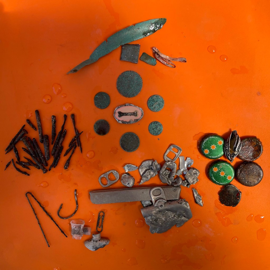 I get plenty of trash, mostly related to drinking from cans and bottles. I get scrappable metal –copper, brass and lead – in the form of screws, nails, wires, fishing gear, etc. That goes into a bucket and eventually maybe I’ll have enough to take to the scrap man. I get recognizable manufactured items, or their carcasses: pocket knives, shell casings and even a .69 caliber musket ball, vape pens, cutlery, and so on. Mostly that’s just trash.