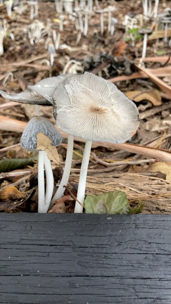 They appear and wither in a day… quite beautiful in the morning but blackened, ripped and contorted by nightfall. Apparently they digest themselves to better spread spores.