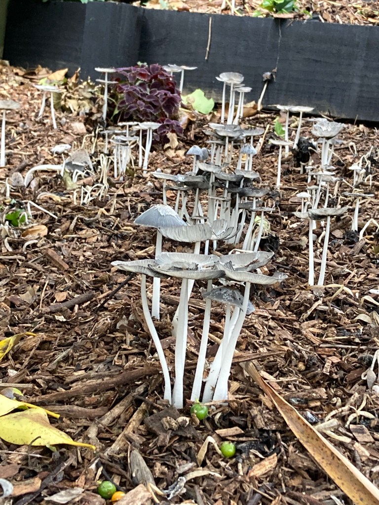 We’ve been growing these little mushroom forests lately out back under the dragon tree. We guess the spores came along with the mulch laid down a few months ago by landscapers we hired to spruce up that part of the back garden.