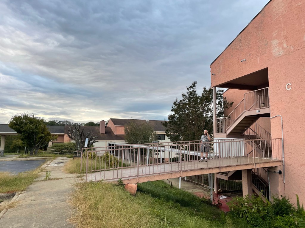 The only place we could get cell service was at the top of the hill near this derelict hotel. Be careful not to step on a needle or a pile of shit.