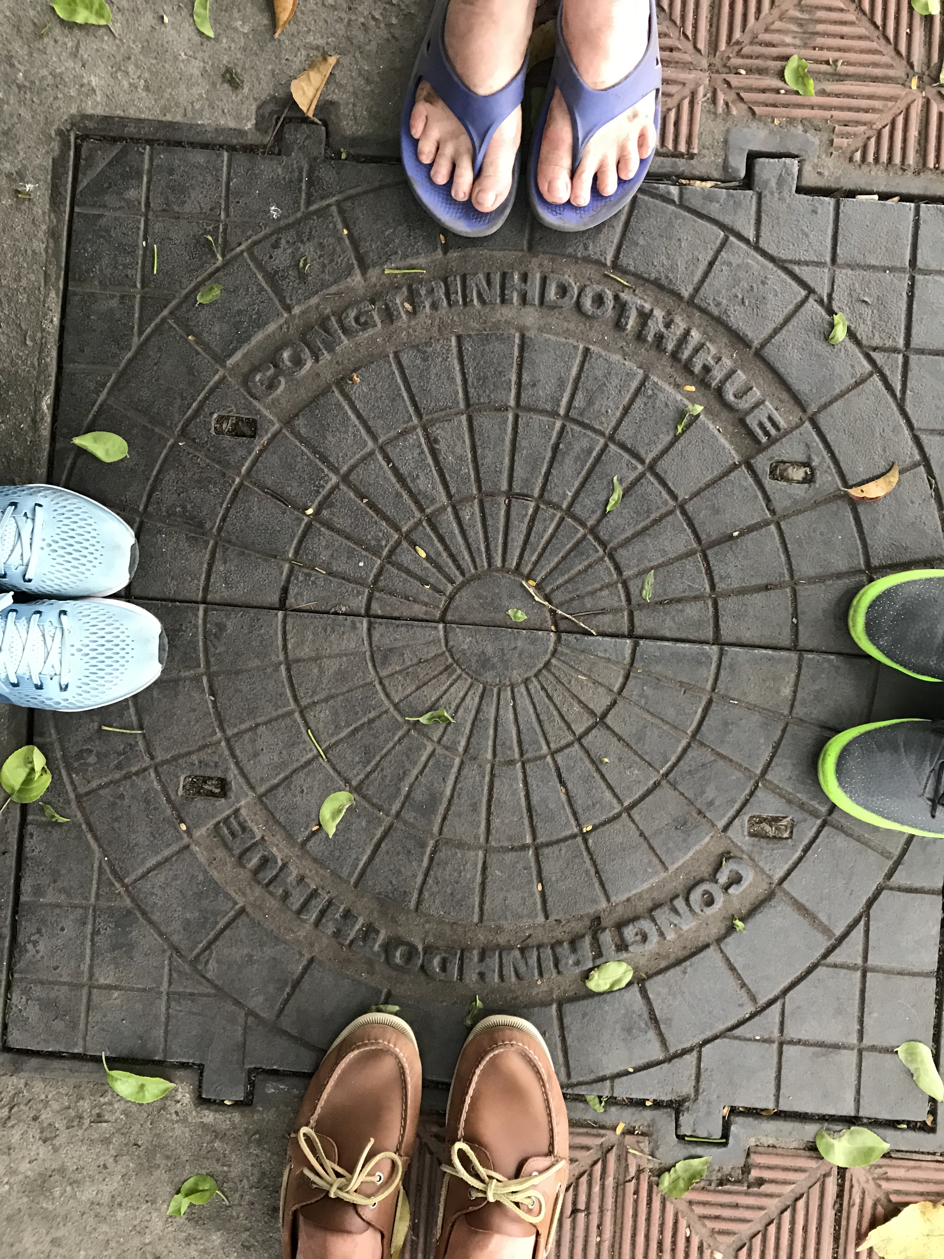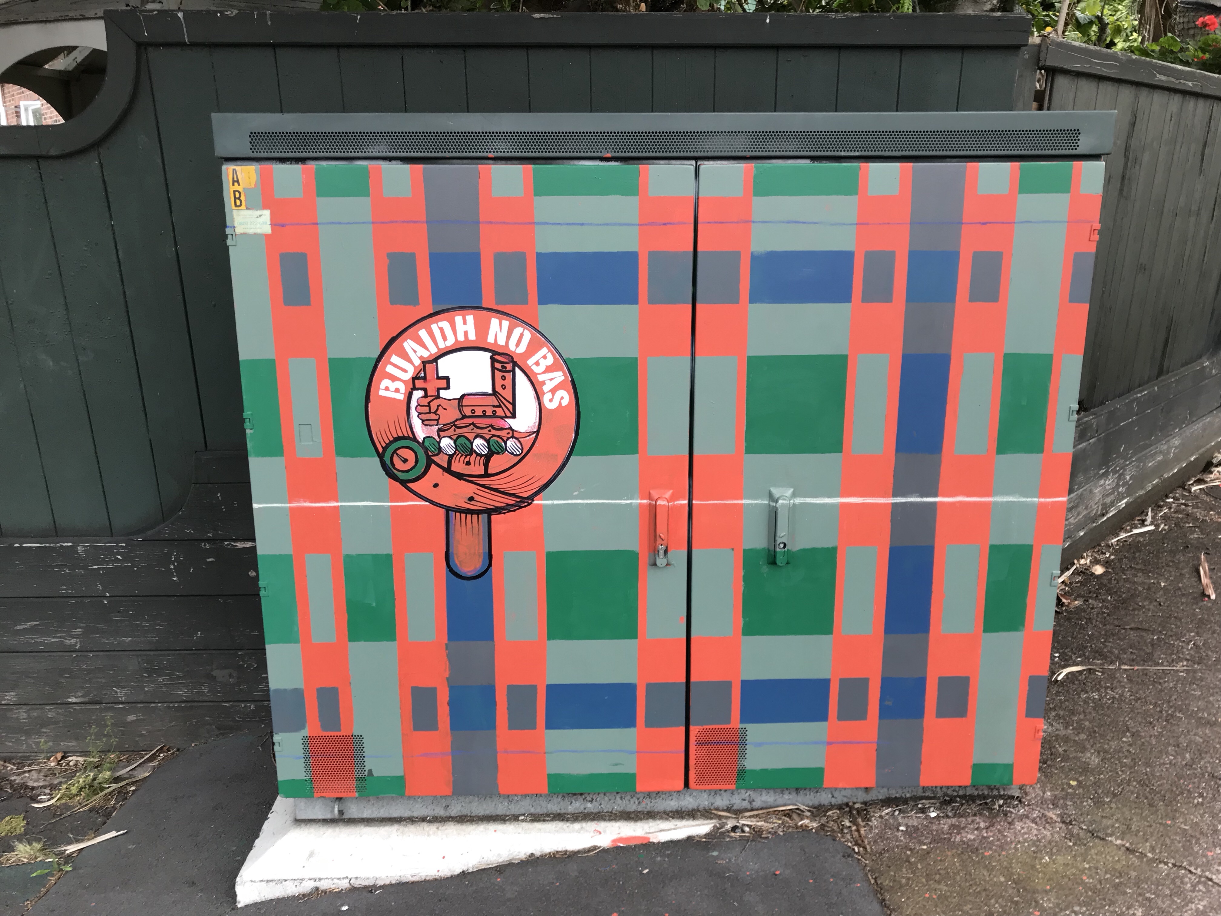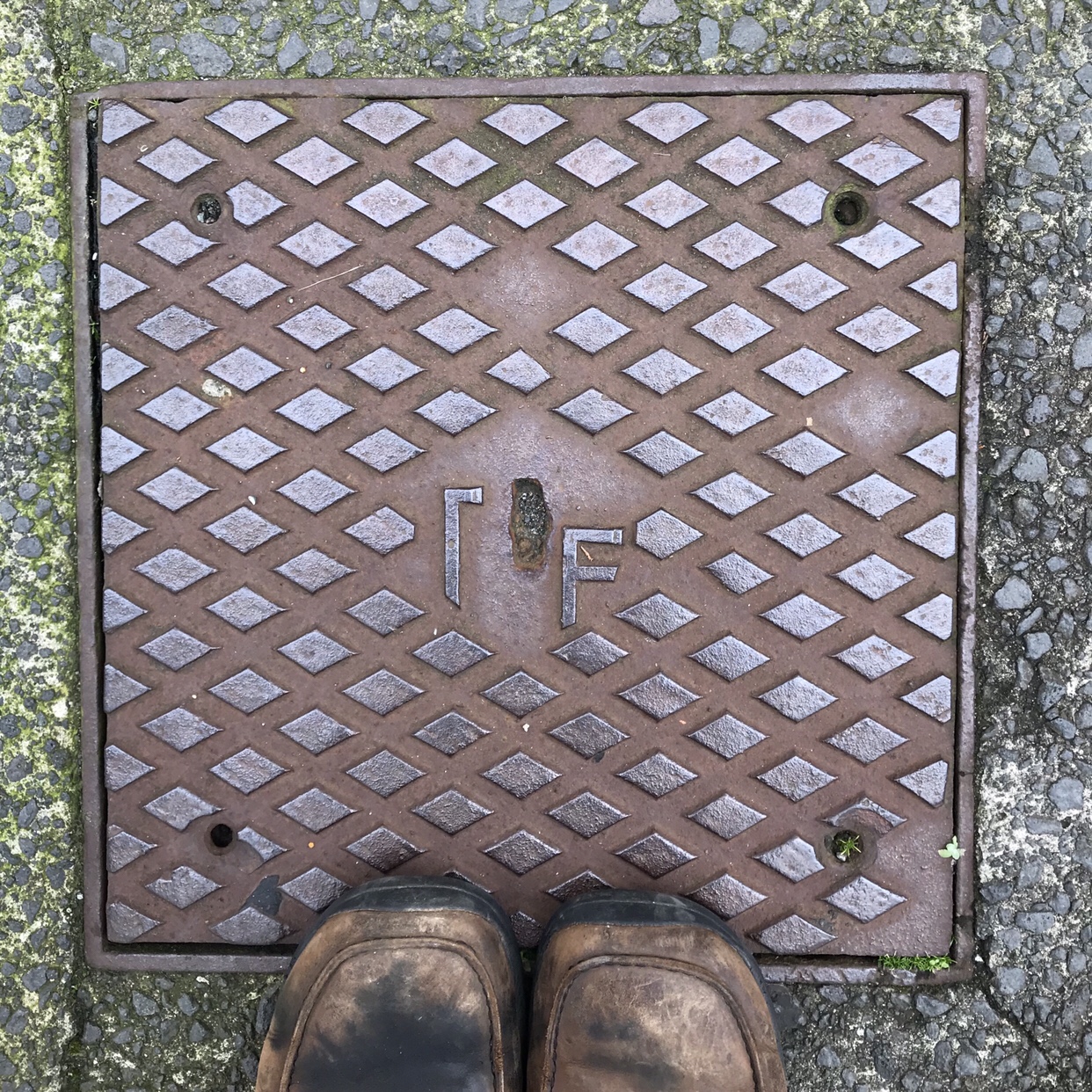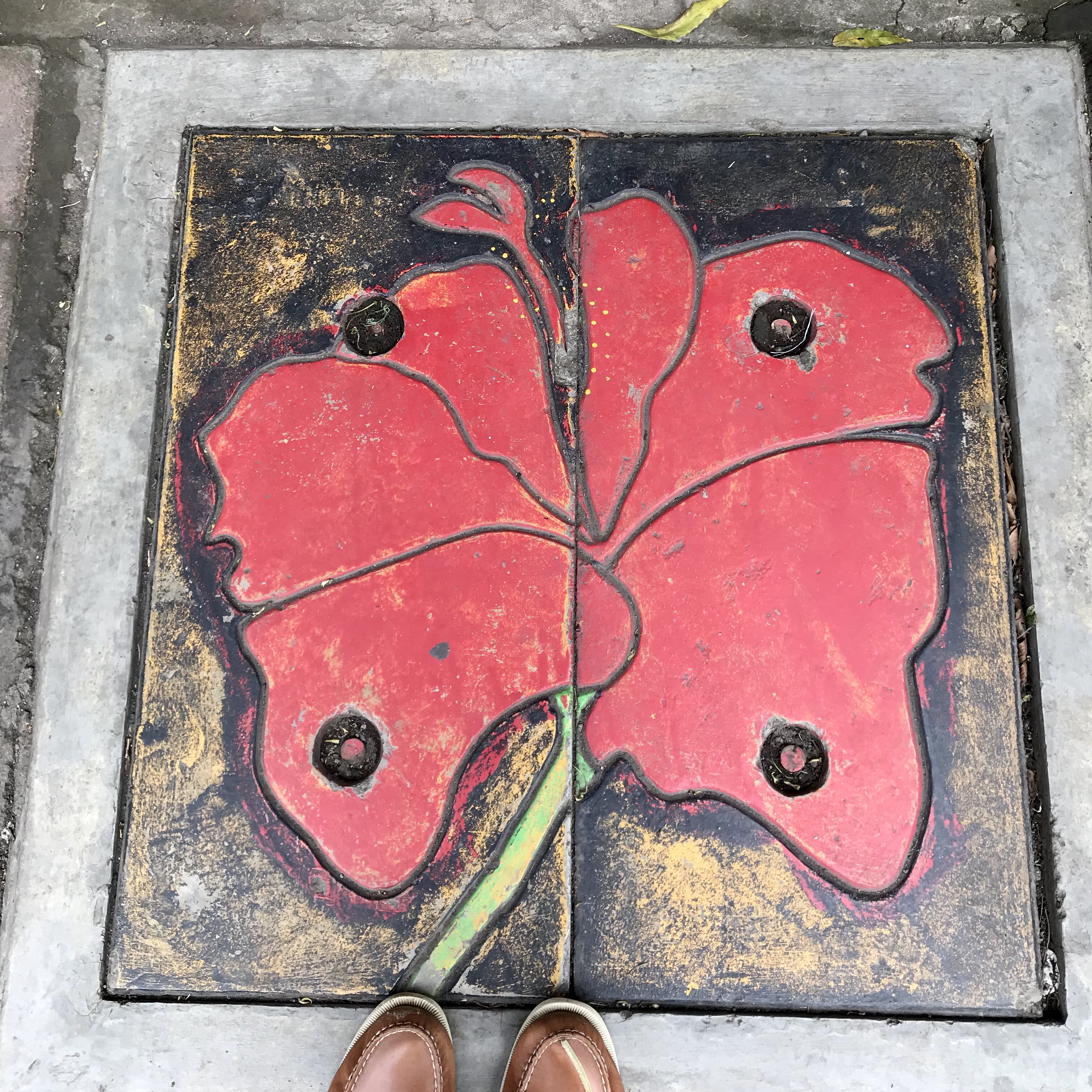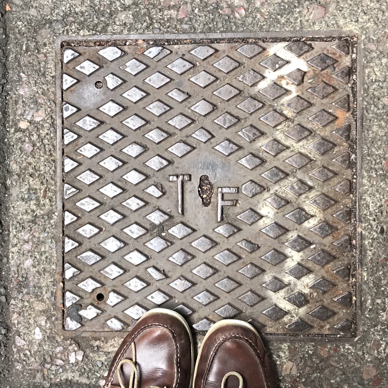 Street furniture. Someday I’ll look up why cities used these glass blocks, always now turning violet, in their sidewalks. Is it just to let in light to the basement?