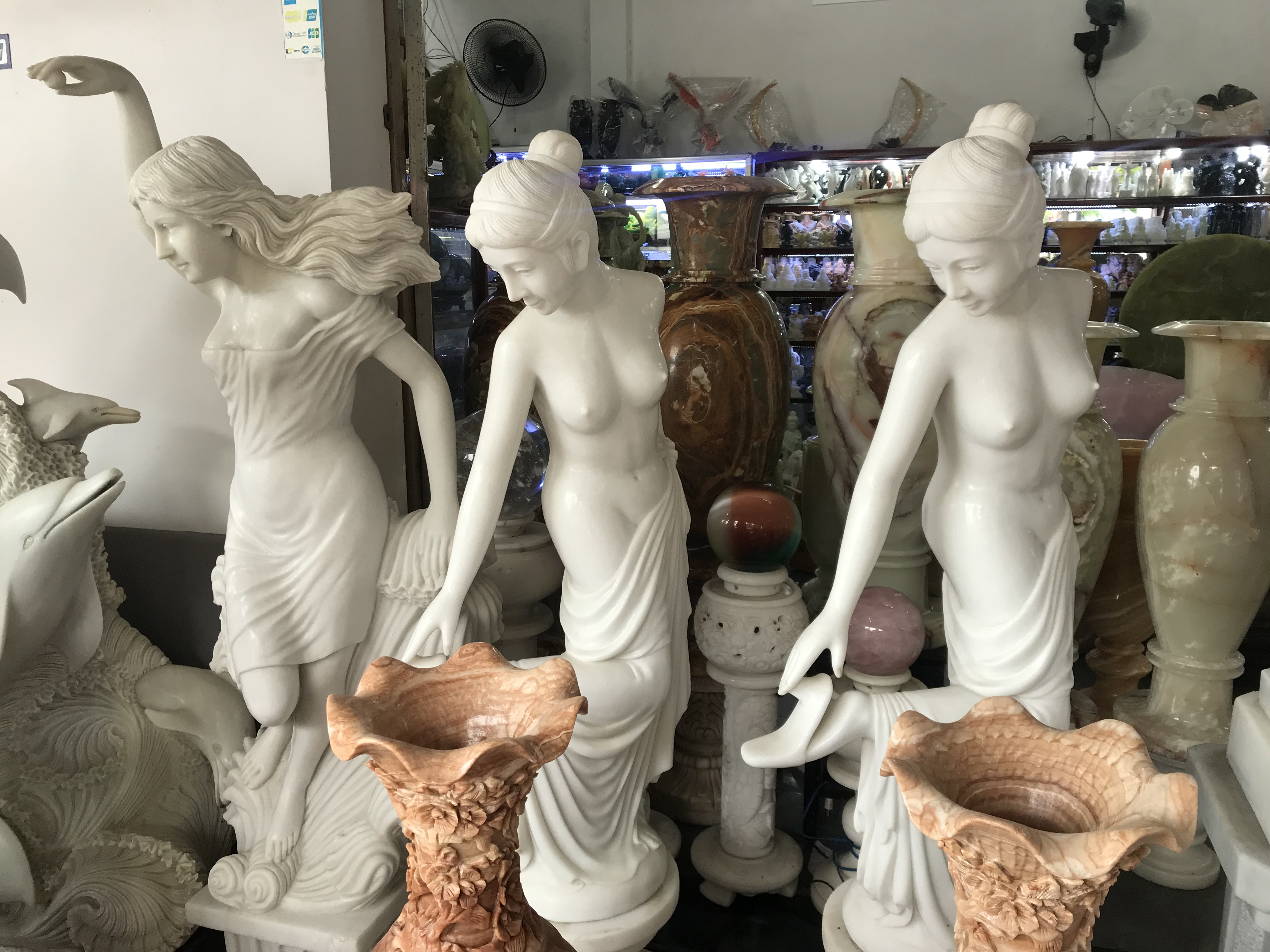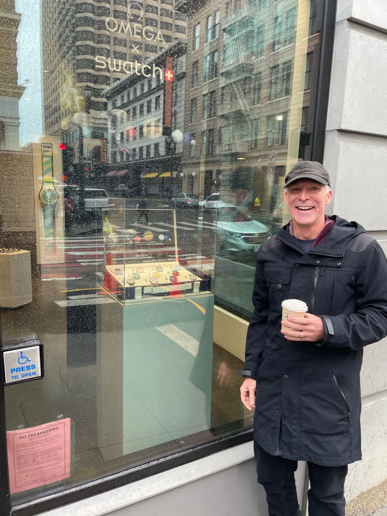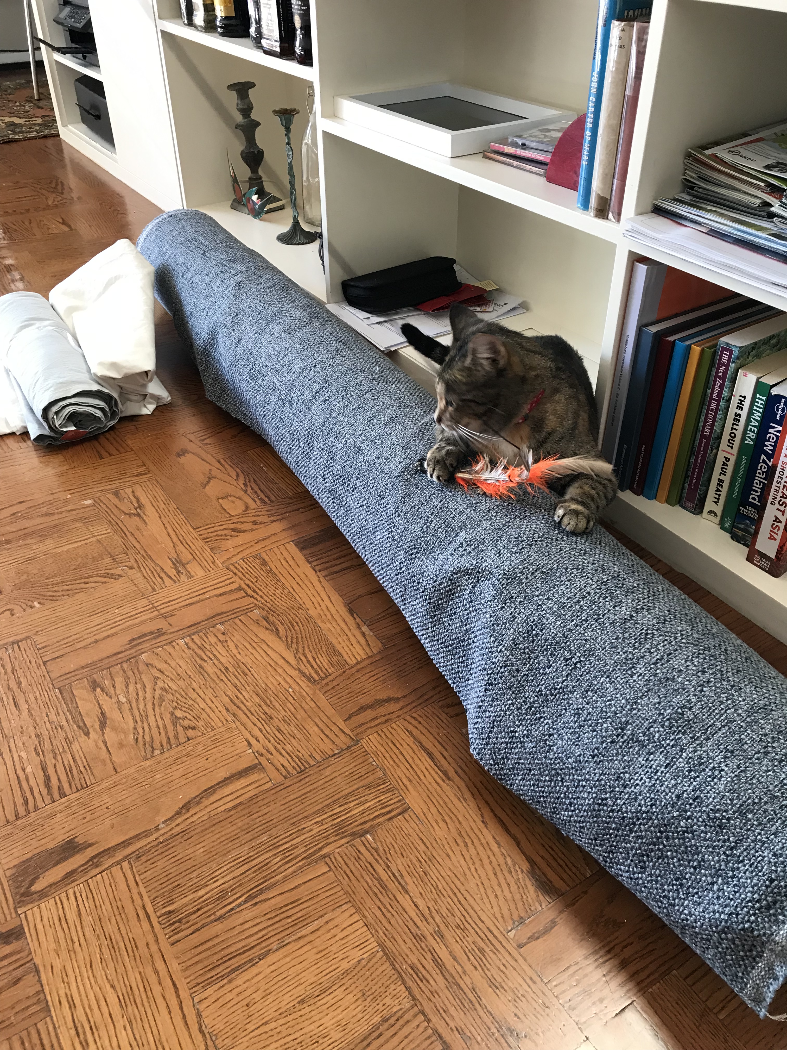 So, then, what fabric to use? We went to a bunch of stores, and looked at zillions of fabrics, but there were really only a few that we liked. The grey nubby fabric we picked got instant cat approval.
