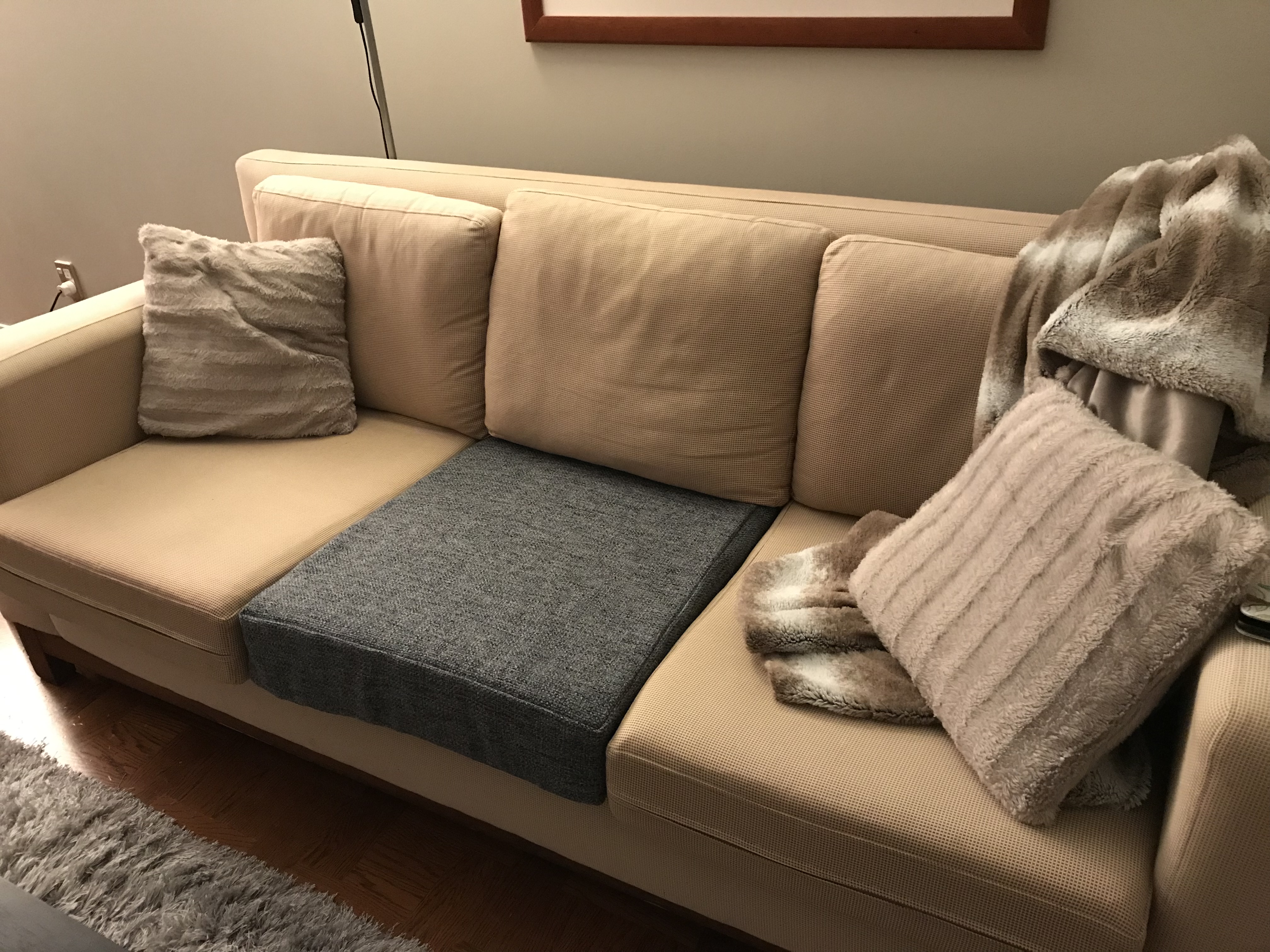 It turned out great! We sat on it for a few weeks and then Lee made a few adjustments and put the bottom hem in place last week. If you look carefully of course you can tell it’s a slip cover, but basically it looks great. And it’s long enough to take naps on, something the old sofa lacked.