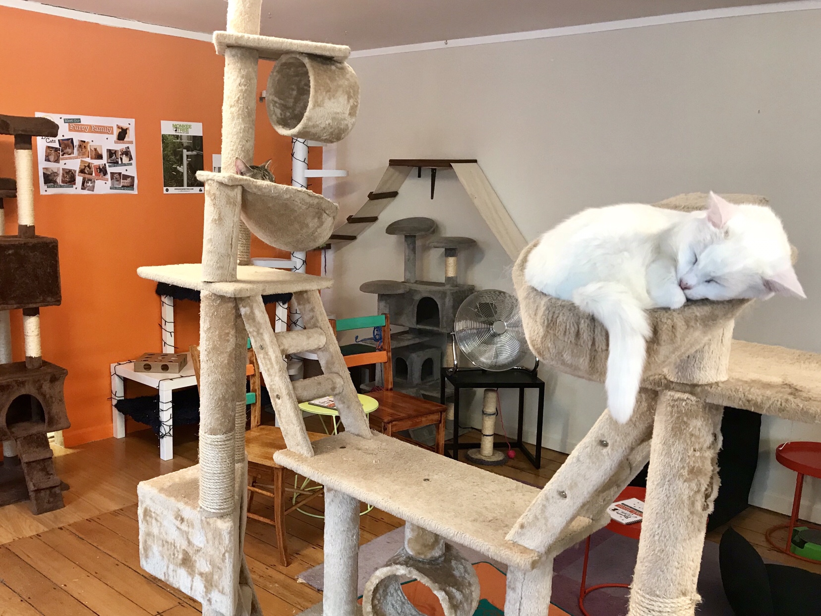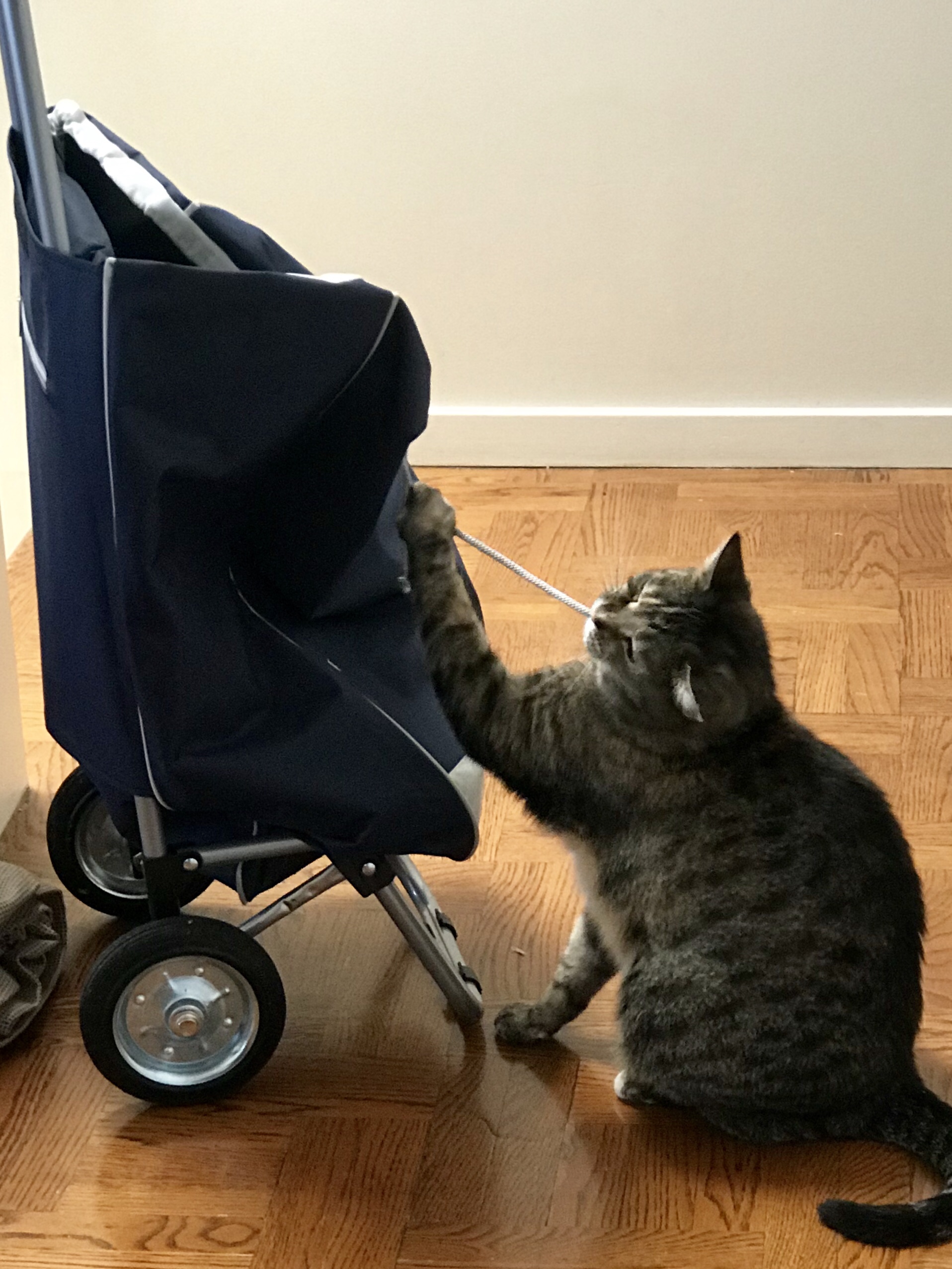 So, then, what fabric to use? We went to a bunch of stores, and looked at zillions of fabrics, but there were really only a few that we liked. The grey nubby fabric we picked got instant cat approval.