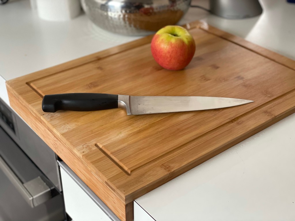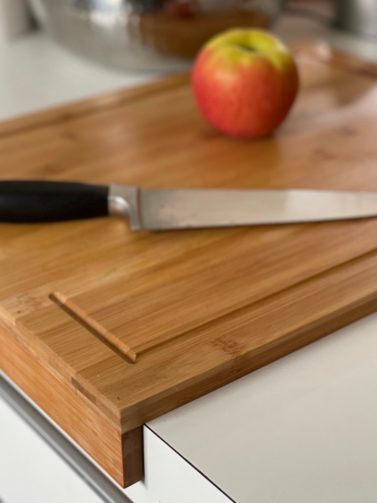 We needed a larger cutting board and hadn’t run across one so went searching online. This bamboo board is wonderful! The way it lips over the edge makes it extra stable (the countertop is perfectly square so that helps). And I thought showing it off with the knife I brought back from my trip to Germany 20 years ago is a nice way to tie old and new.