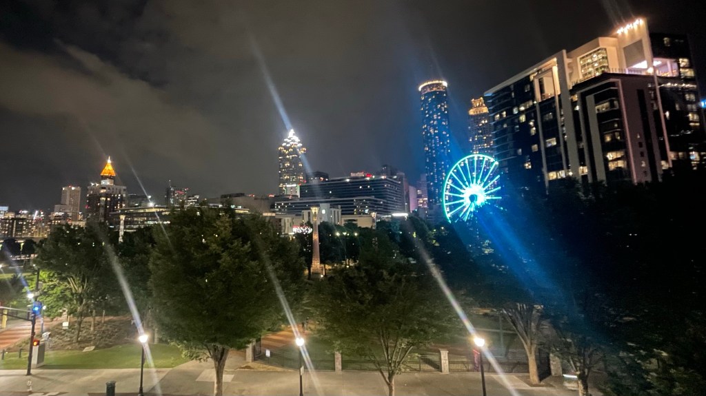 Unintended lens flare looks kinda cool in this picture looking across Atlanta’s Centennial Park.