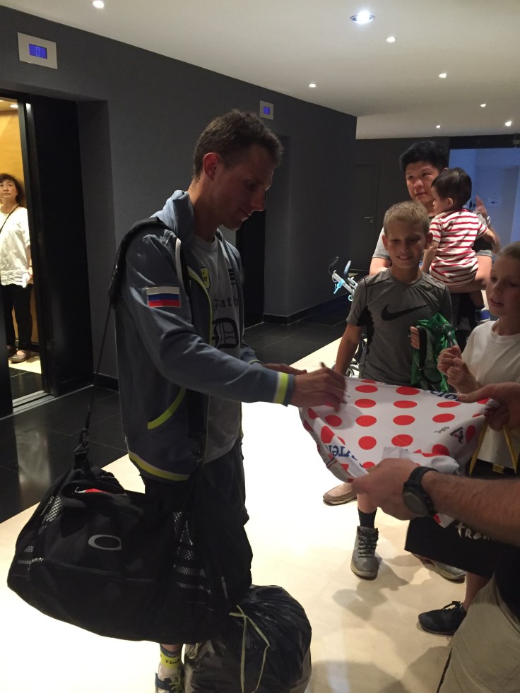 Hitting the room around 10 pm, dinner was out of the question. The dedicated autograph hounds were rewarded, but I didn’t have the patience and so headed upstairs. Here’s Rafal Majka, King of the Mountains, signing a jersey.
