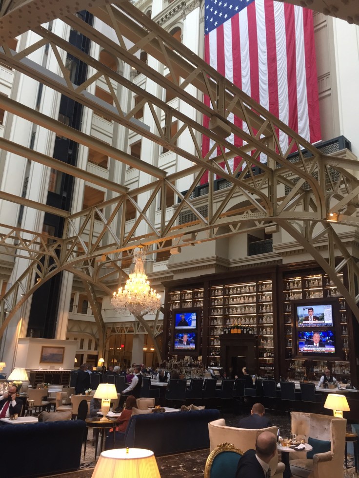 I am having these thoughts because I violated something I guess is a core belief. I walked into the beast’s mouth on my own. Then I actively, consciously contributed to the good fortunes of our national car wreck in chief by having a drink in the bar of his hotel near the White House. It was a good drink, in fact, but obscenely overpriced. And it is a beautiful lobby, staffed full of people of many colors, from many lands, whose eyes I mostly had a hard time meeting.