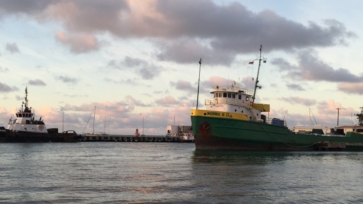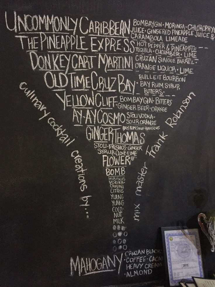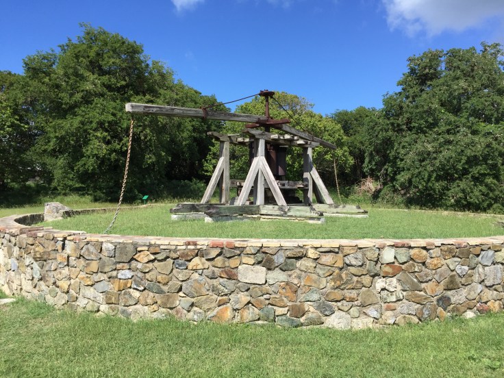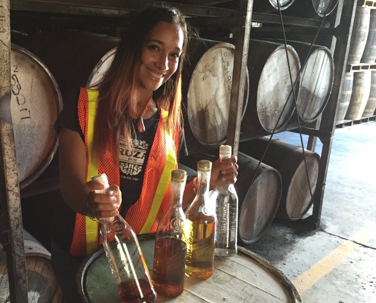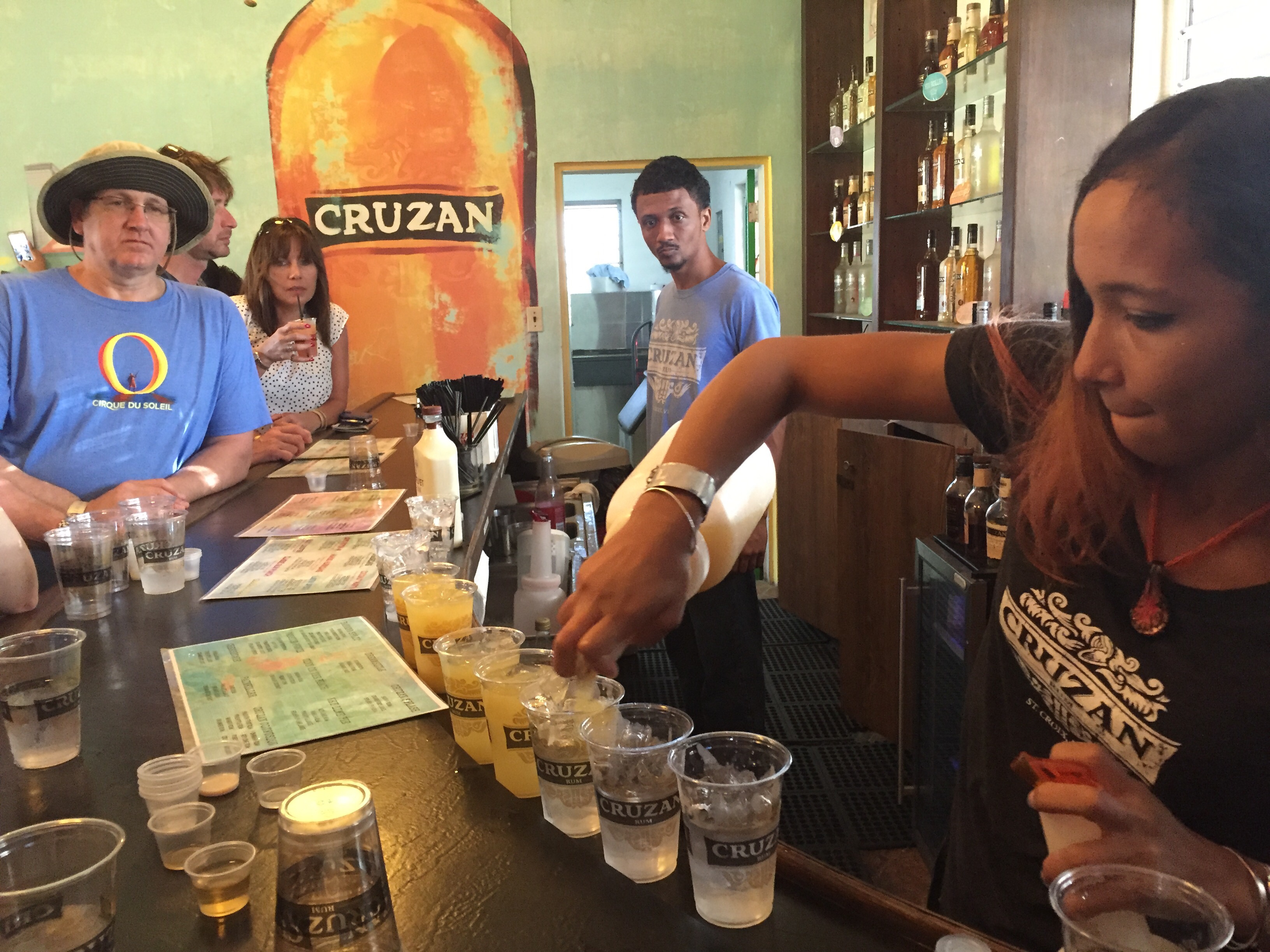 The distillery tour, which debouches (debauches?) into the tasting room and bar, turned out to be the cheapest drinks on the island. Here, our tour guide shows what 12 years of evaporation looks like… the missing volume is called the Angel’s Share.