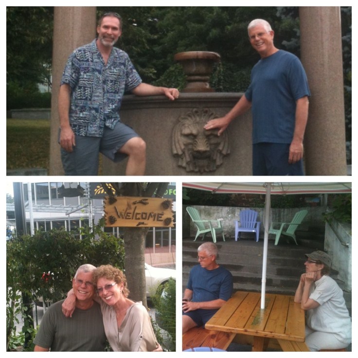 Brother Frank visiting from Katy. Clockwise from top, at the fountain up the road, at Humble Kitchen food cart in the Harmony Parking Lot, and at the new Brattleboro Food Co-op.