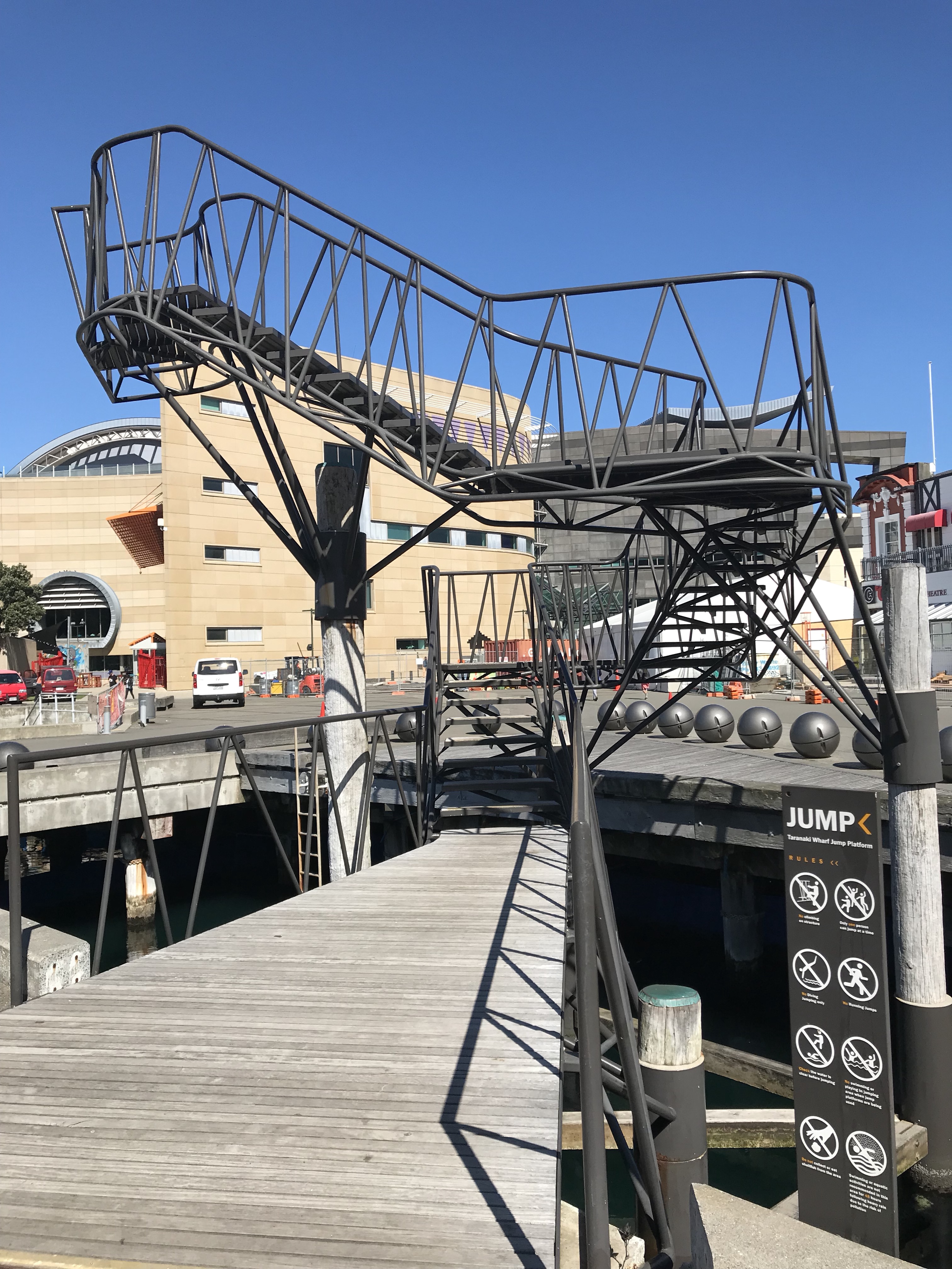 This platform on the Wellington waterfront invites you to just jump in. It might be 20′ to the surface of the water, and it must be cold, and this is the busy part of the harbor. All in all, no thanks.