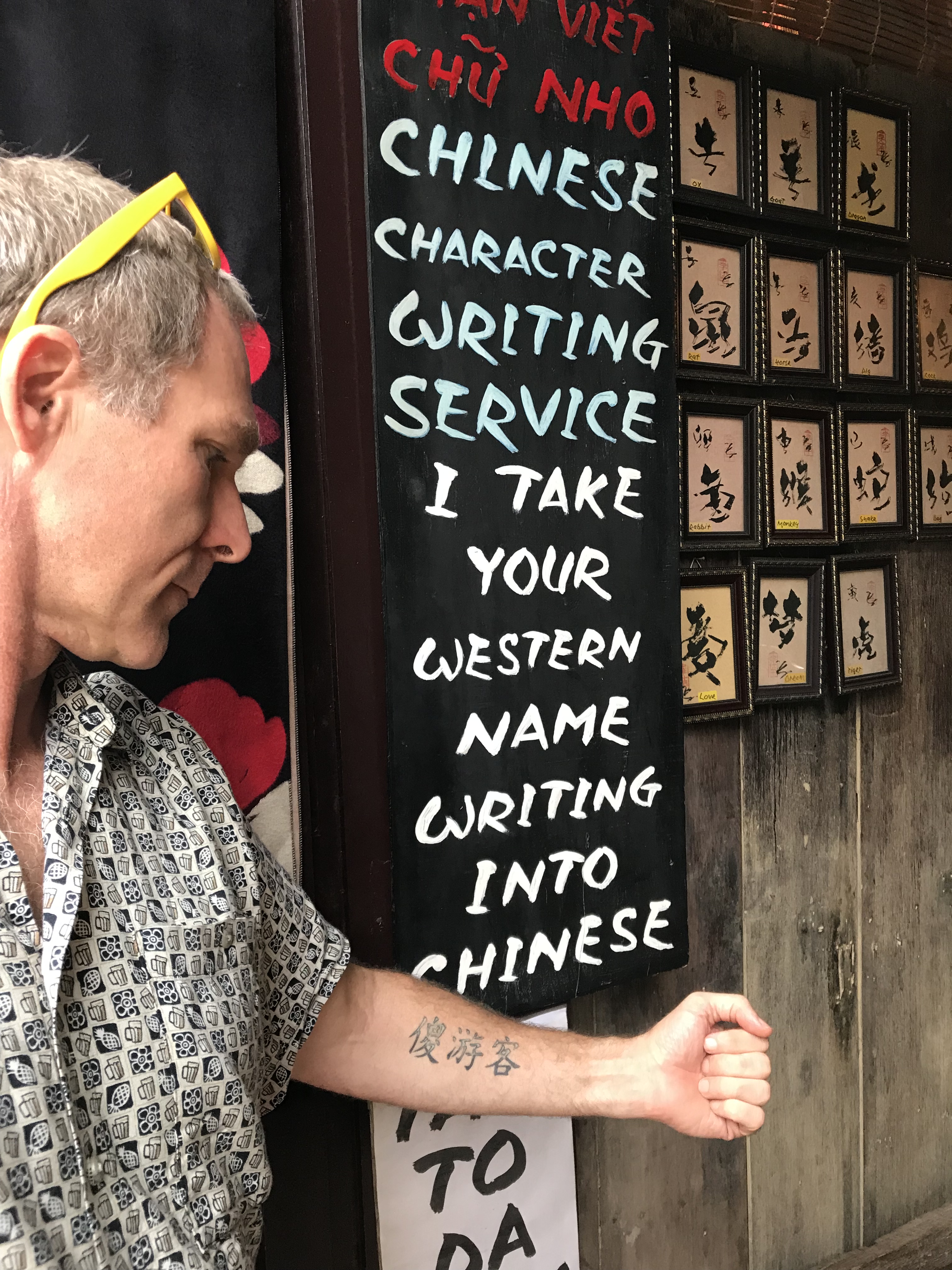 But all that got me thinking a few years ago when the time came to get a little middle-aged ink. What if I pre-empted the scammers? What if I punked a billion Chinese people by getting “foolish tourist” carved into my arm?