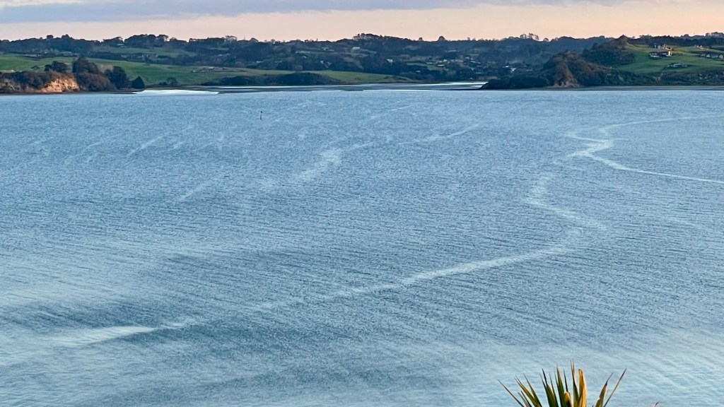 As we sit and ponder our new view, we see stripes in the bay most of the time. Contrails proving the existence of mer-people? Dolphin tracks? Boat wakes?
