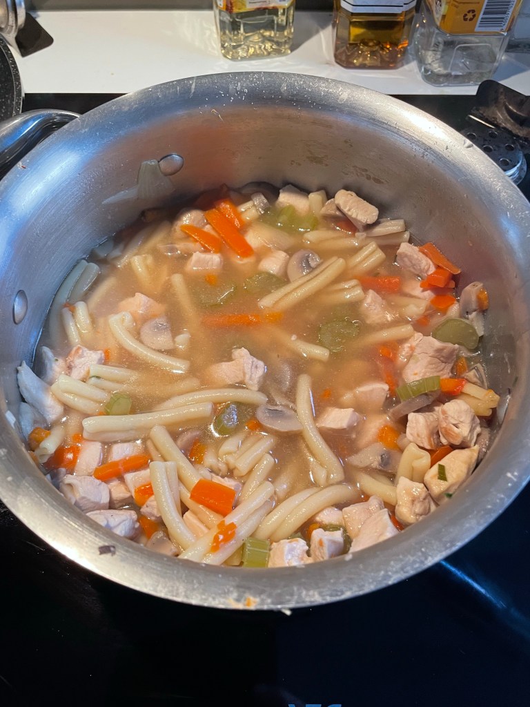 An absolutely delicious pot of chicken soup that Lee made for me! She thankfully never got sick or even tested positive.