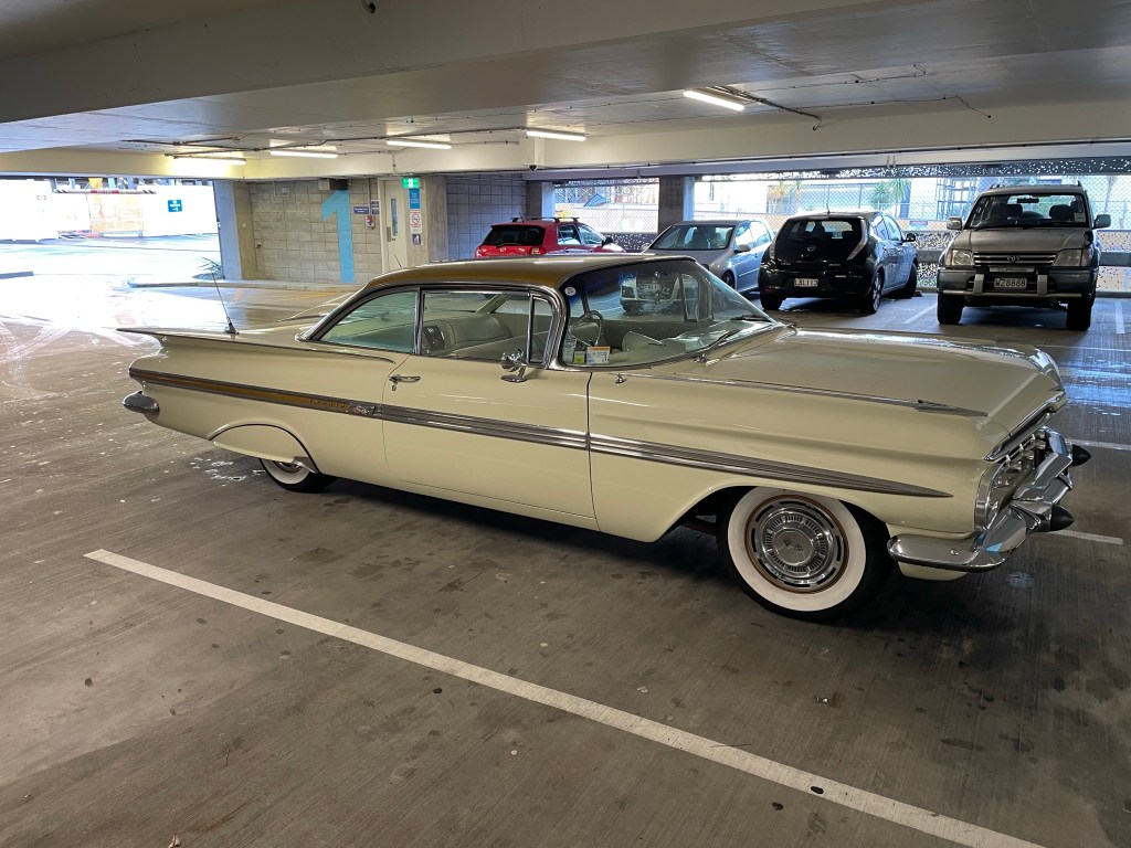 Below is a 1959 Impala who pulled into a garage just ahead of me recently. It was beautiful, but as I watched it jounce over the speed bumps I had a chance to reflect on what I really value in a car. Like, sure, if I were made of money I would let my horizons widen out a bit. But having to limit myself to one? Boringly, the minivan wins every time.