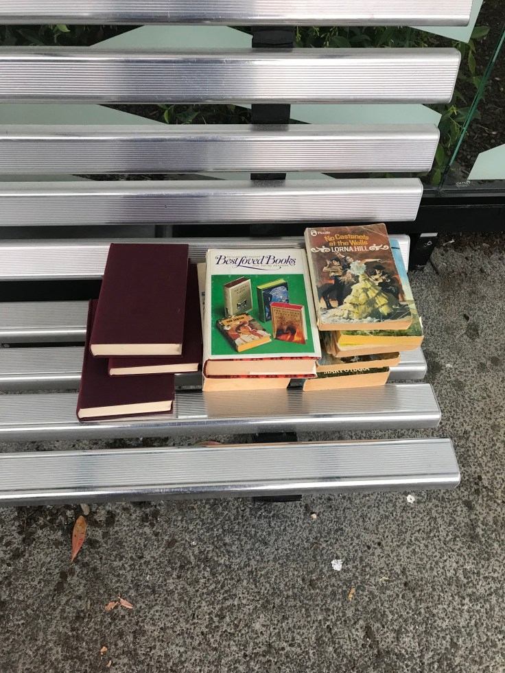 This was the second time in recent weeks that I’ve seen a pile of books on this bus stop bench.