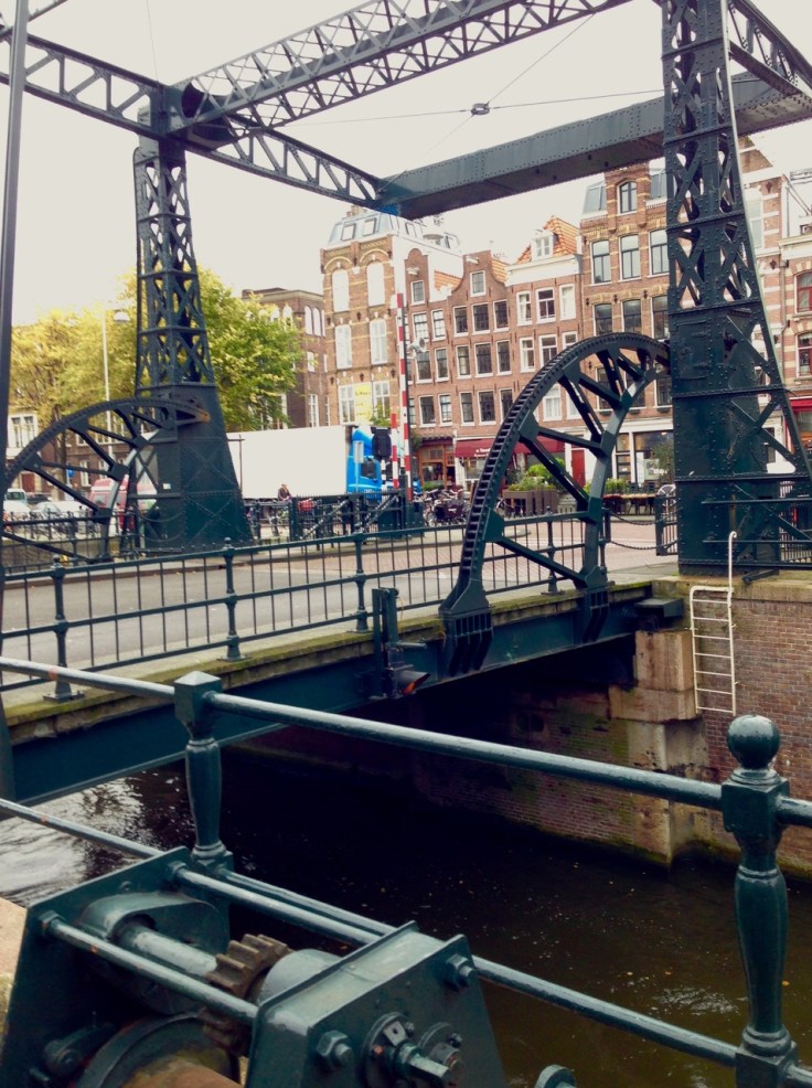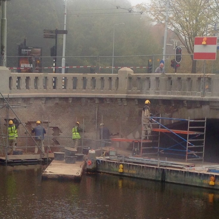 To the right of the frame, there’s a big repaving project going on. So, how do you detour the pedestrians? Answer: build a floating walkway in the canal.