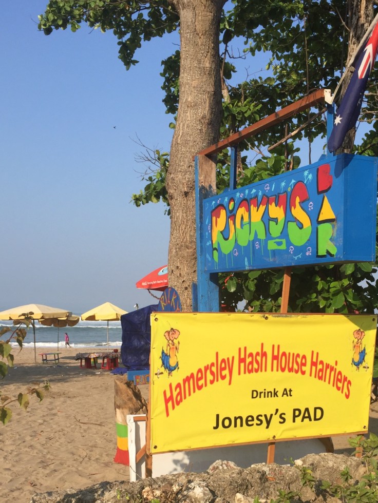 The modal tourist in Bali is Australian, and he or she doesn’t mind a drink. The beach is dotted with open-air establishments, little more than some plastic chairs and an ice chest, catering to this tourist’s needs. With $100 flights and $20 rooms easily available, even hashers from Perth can afford a few cans of Bintang.