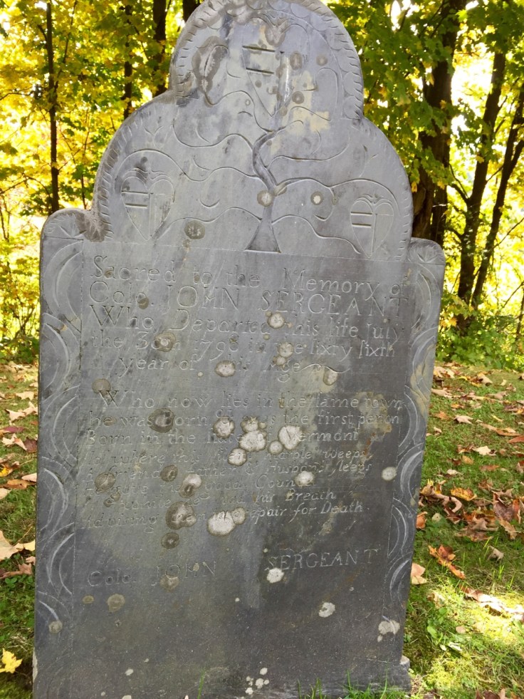 Sacred to the memory of Colo. John Sergeant who departed this life July the 30th 1798 in the fixty fixth year of his age. Who now lies in the fame town he was born & was the first person Born in the ftate of Vermont.