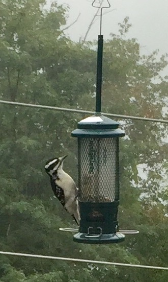 A foggy morning and a downy (hairy?) woodpecker, home sweet home.
