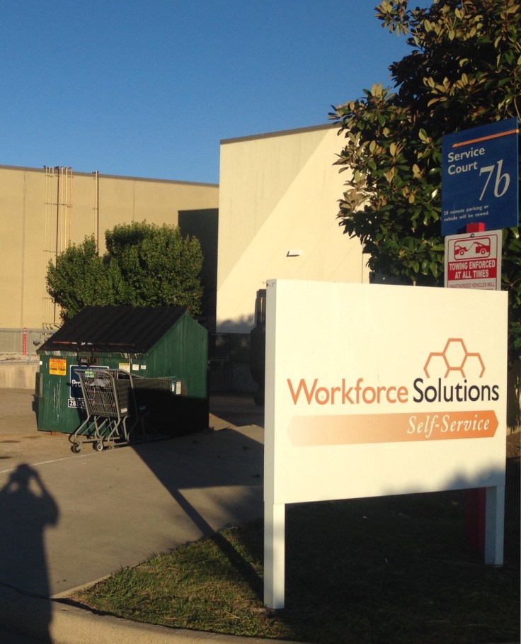 Around the back of the huge outlet mall, I found this sign for Workforce Solutions Self-Service.