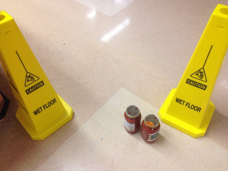 Why are these two jars of red sauce sitting on the floor in the produce department, near the potatoes? Why are they leaking? And most puzzlingly, why did protocol dictate that the guy with the Wet Floor sign leave the pasta sauce in flagrante? Will the CSI team be along soon? Or does Wet Floor Guy know something the rest of us don’t?