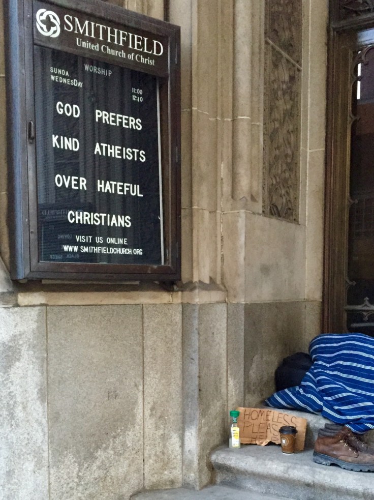 “What? Yeah, sure we are, always looking for good people! You go out by the loading dock and you’ll see a shopping cart and a dumpster. You can just take it from there, it’s self-service. Have a blessed day!”